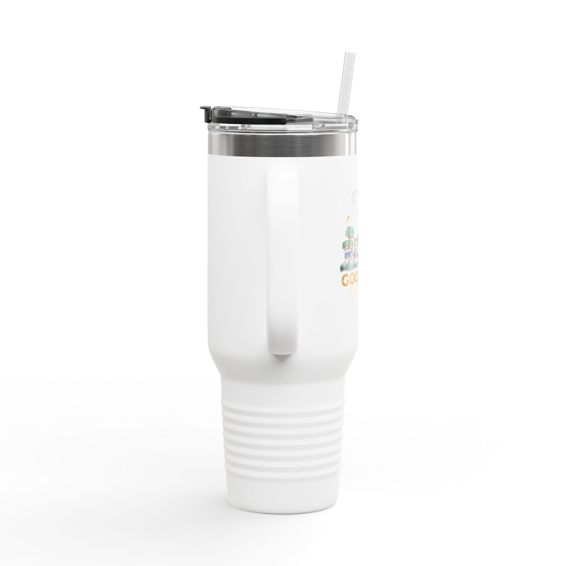 This 40oz insulated travel mug brings rugged reliability to long drives, trail mornings, and slow moments outdoors. Its double-wall stainless steel build keeps drinks hot or cold for hours, while the ergonomic handle, large capacity, and leak-resistant lid with straw make it easy to take your favorite drink anywhere. Finished with a durable powder coat and UV-DTF printed Good Dog scenic artwork, it stays crisp through every adventure. Designed for Good Dog Veterinary Care, this Special Edition mug reflects the calm, trust, and connection at the heart of Good Dog, a small touch of warmth you can carry with you.